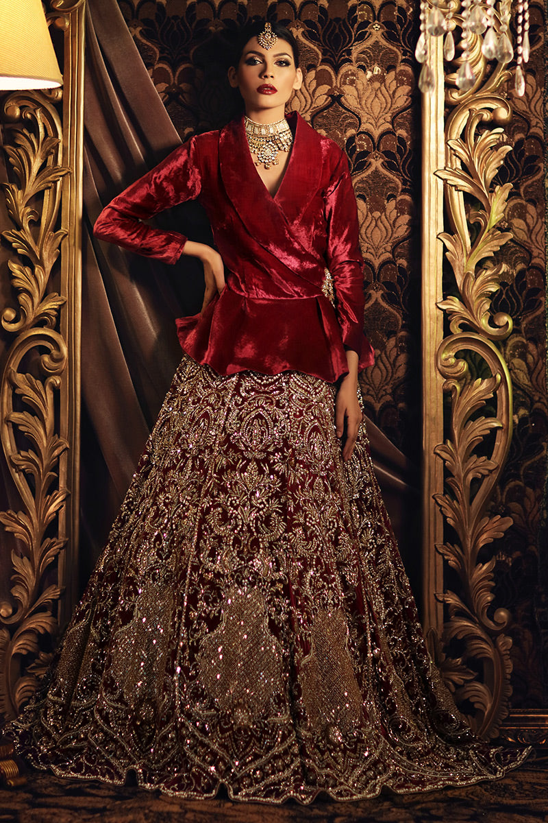 Bano - a traditional ensemble. Rich velvet jacket has intricate zardozi work brooch?ÿwhich is further accentuated with the use of semi-precious stones. Ravishing red Duchess Satin lehenga is heavily embellished all over and the lower part. Paired with beautifully embellished lehenga in deep red velvet?ÿfor perfect harmony.The shipping charges for all articles barring Bridals are as follows: