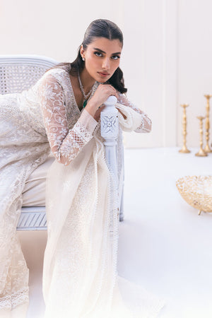 The "Bano" ensemble is a vision of elegance and grace. The all-white organza kalidar features a hand-embellished upper half, adorned with delicate laces for a touch of sophistication. It is paired with straight white raw silk pants, adding a modern flair to the traditional silhouette. The organza dupatta complements the outfit with its intricate embroidery work, completing the ensemble with a timeless and elegant finish.