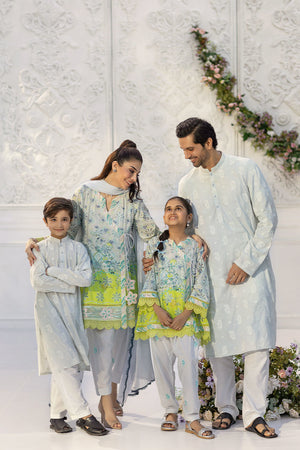 Rendered in a soft dove grey, this kurta is detailed with delicate schiffli embroidery, bringing texture and depth to a classic silhouette. Paired with matching pants, the subtle design strikes the perfect balance between understated and refined — ideal for festive moments or family portraits alike.
