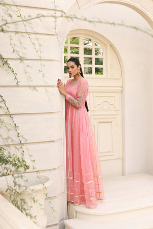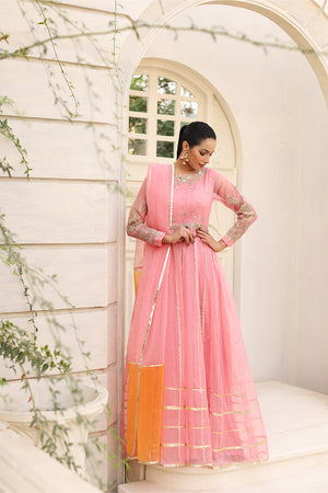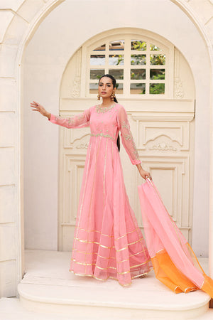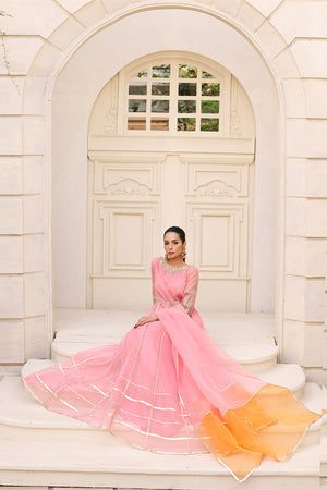 Dress yourself in this traditional pink pishwas. It has stithing details of gotta & embroidered paired organza dupatta with colour block pallu..