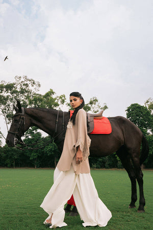An eye-catching nude, loose-fit kurta features an embellished motif on the neckline and pocket detailing, accentuated by a stunning gold chain. The sleeves are wide and flared, providing a breezy, elegant appearance. This kurta is paired with ivory wide-leg flared pants to complete the look.