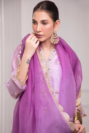 This seasons most demanding lavender pure raw silk kurta with delicate gota and thread work all over the shirt, styled with skinny shalwar and luxury organza shaded dupatta. Dupatta and shalwar can be purchased separately.Fabric: Raw Silk
