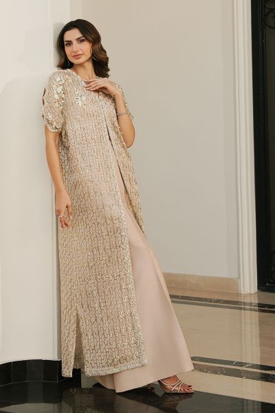 This elegant beige outfit combines classic sophistication with contemporary flair. The long kaftan-style shirt features a graceful cutline, flowing effortlessly to create a flattering silhouette. Shimmering embellishments delicately accentuate the neckline and edges, adding a touch of opulence without overpowering the simplicity of the design. Paired with straight trousers, the outfit exudes a sleek and refined look, balancing fluidity with structure. Perfect for formal occasions or evening events, this ensemble captures understated luxury and timeless elegance.