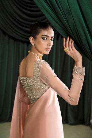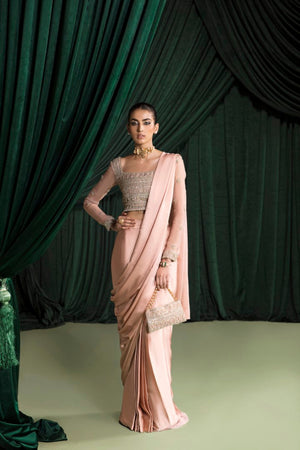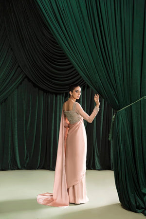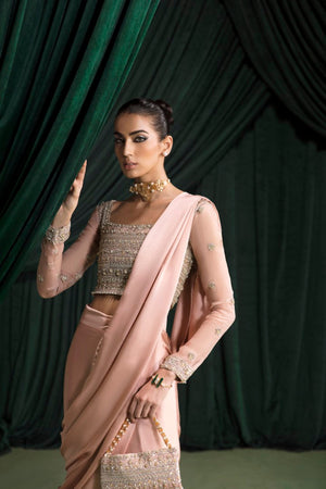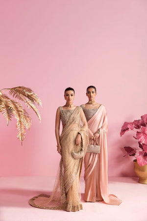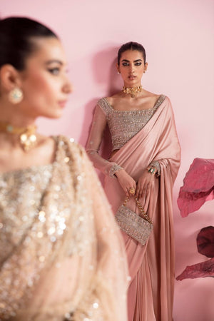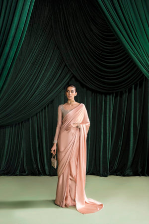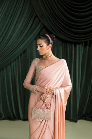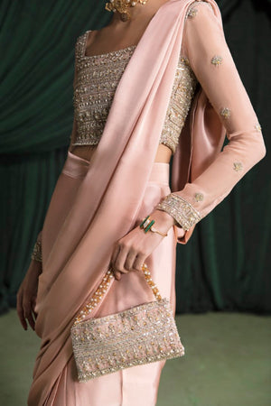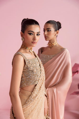 This pink saree in pure charmeuse with hand embellished organza blouse is the epitome of elegance and femininity. The blouse is made from sheer organza, which has been expertly hand- embellished with intricate details that catch the eye and capture the imagination. The embellishments add texture and depth to the blouse.The combination of the delicate organza and the sparkling embellishments creates a stunning contrast that is both unique and captivating. The saree is crafted from a luxurious pure charmeuse fabric, which drapes beautifully and adds a touch of glamour to any occasion. The subtle pink hue is soft and delicate, evoking a sense of romance and sophistication.