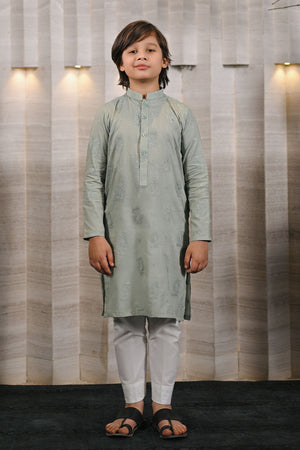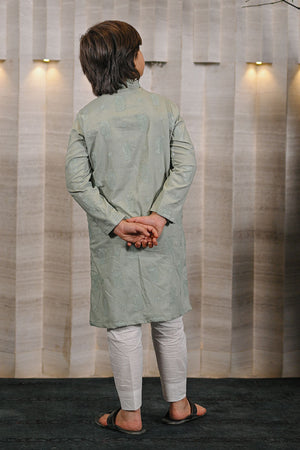 A sage green kurta with subtle self-embroidery, paired with white pants for a fresh and refined look.
