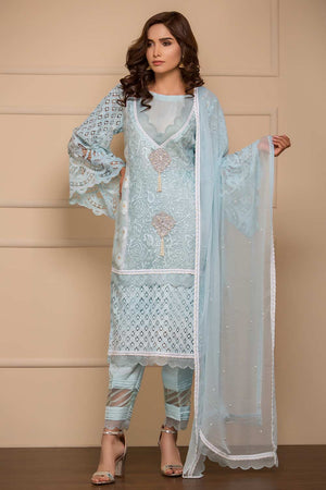 Premium Organza Shirt Detailed with laces and handwork motif of kora dabka and stones mixed up with qureshia daman and sleeves with pleated detail trousers with scallops and lace edged dupatta.