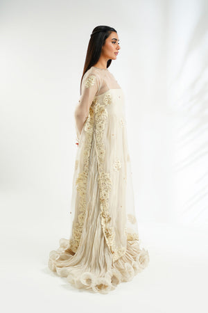 Exuding sophistication, a masterfully tailored sheer ivory tunic paired with a matching khaddi silk dress that flares out into crushed, sweeping ruffles. The organza top is embellished with intricate tonal aari embroidery and sequin on the borders and dispersed along the flattering silhouette, enhancing the elegance of the festive outfit.