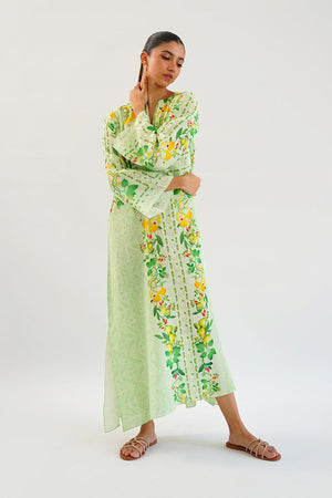 A refreshing tea green crepe kaftan is designed to embrace movement and style. The floral print is an ode to the blooming gardens in the summer time, making the dress perfect for casual soirées and rejuvenating holidays alike.