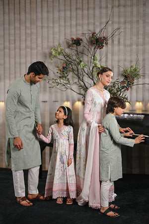 A stunning white Kalidaar, adorned with printed florals in soft pinks and blues, and embellished with graceful pink lace and embroidered organza borders.