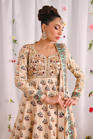A refined celebration of colors and craftsmanship, this ensemble features a Raw Silk Kalidar in a captivating discharge print of aqua, rust, and maroon on a cream base. The Kalidar is adorned with intricate gota, sitara, tikki stones, and cut dana detailing, bringing a touch of opulence to this timeless piece. The lehenga, also in Raw Silk, is exquisitely finished with gota detailing on the hem, while the medium silk discharge print dupatta, embellished with botis and a delicately designed border, completes this sophisticated and experimental ensemble.