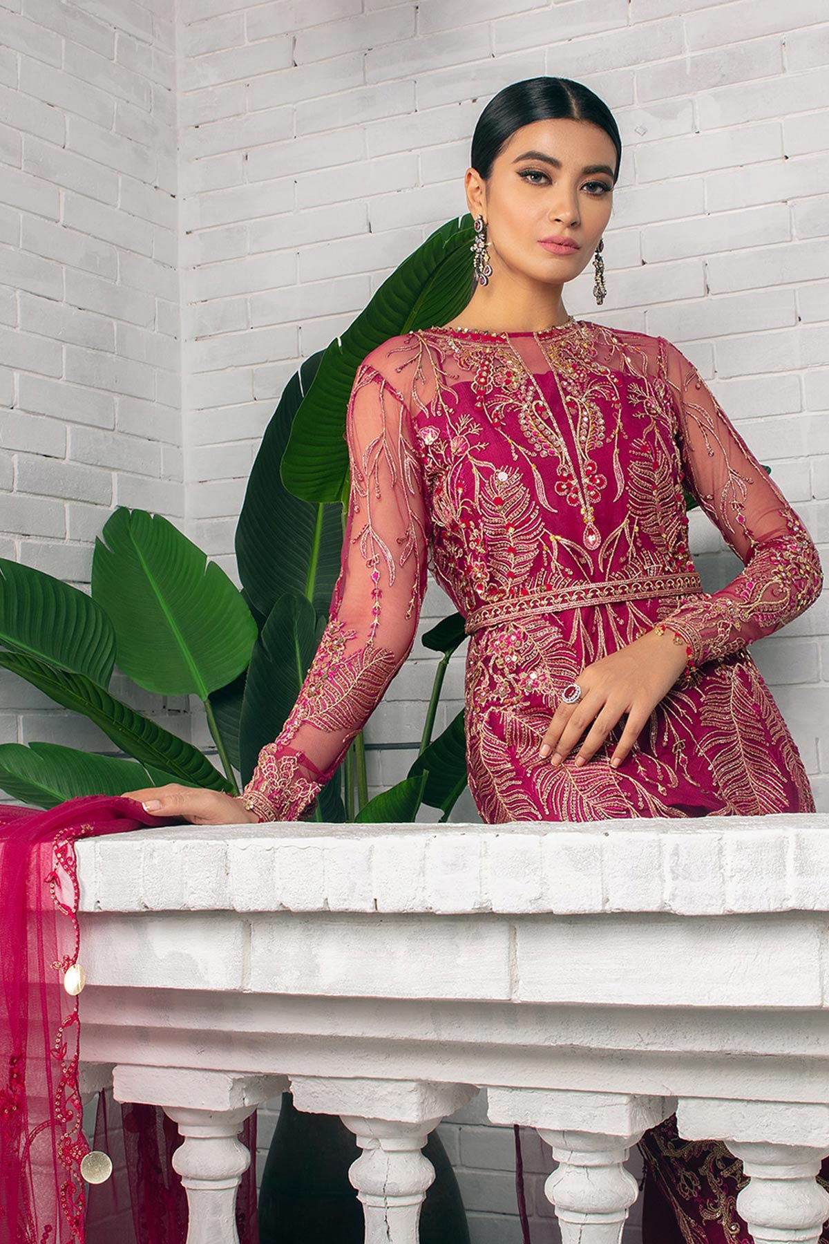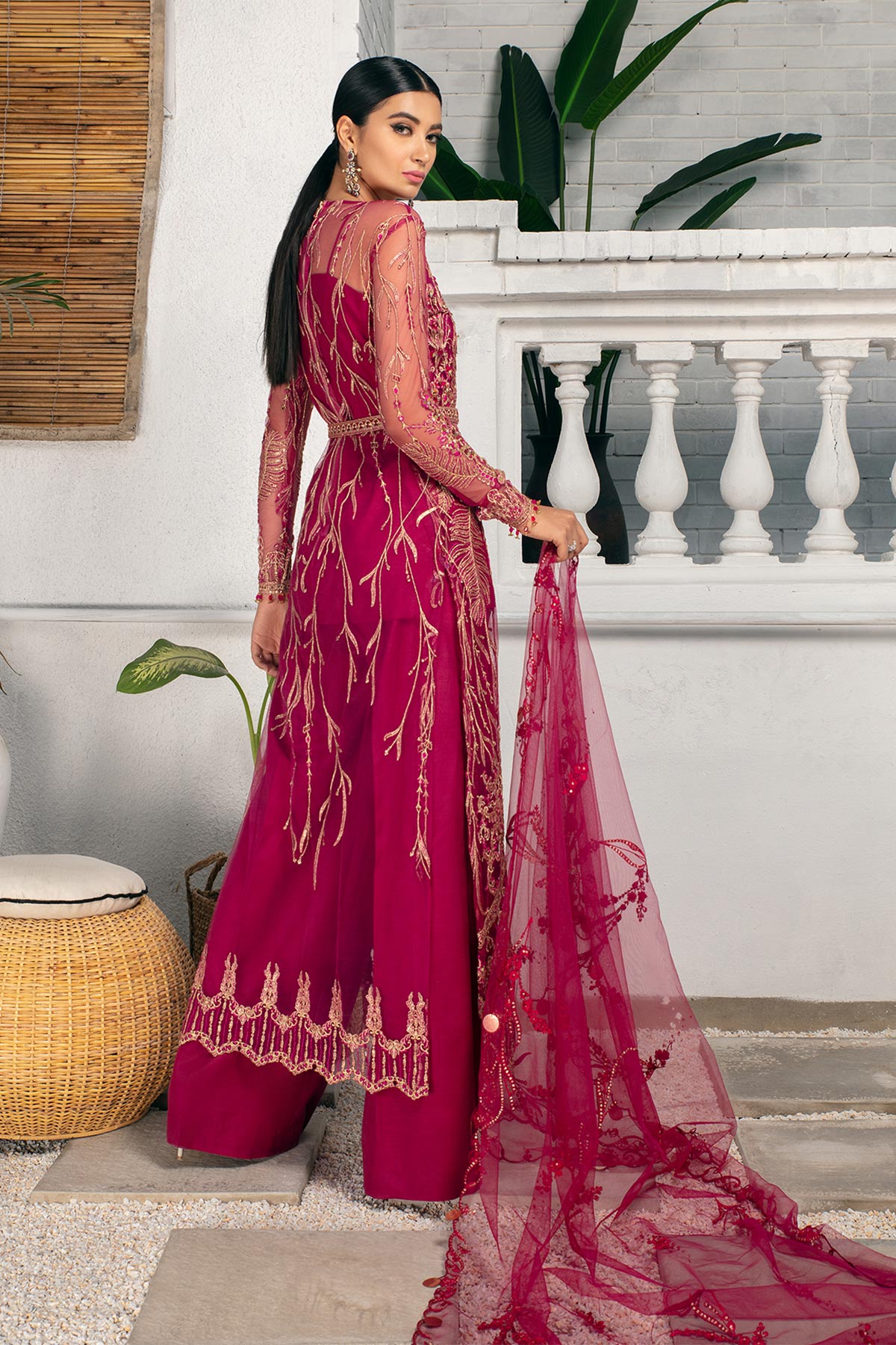 The slip and Trouser are of Raw Silk. All the details shown in the sample will be included i.e., Tassels on the hem line, sleeves and dupatta border, Full slip that covers the shoulder area (we do not provide with spaghetti strap slip), laces and Belt will be included in the stitched version.