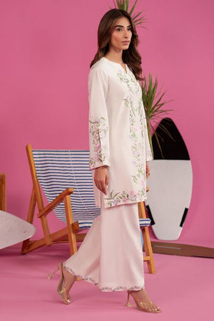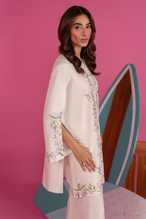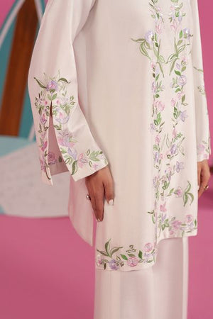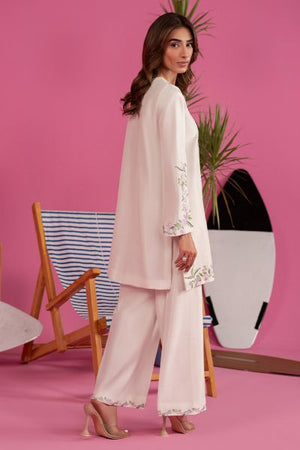 This refreshing ensemble in pristine white offers a perfect canvas for vibrant artistry and modern tailoring. The short shirt features a minimalist cut, allowing the focus to remain on the intricate, colorful embroidery expertly placed in unexpected, asymmetrical patterns that add a bold contemporary flair. Hints of florals, geometrics, and abstract forms in vivid shades bring the piece to life with energy and elegance.Paired with matching culottes, the trousers mirror the shirt’s design ethos, showcasing coordinated embroidery near the hems and side panels. The thoughtful placement of motifs ensures balance and harmony throughout the look. Chic, playful, and refined, this outfit effortlessly merges minimalism with statement-making detail.
