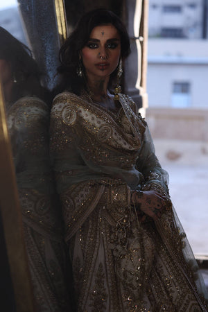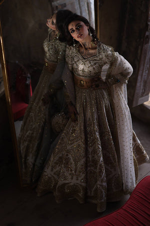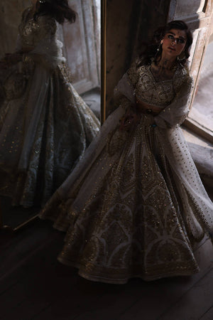 Illuminate the room with "Bibbojaan" in pearl white and gold from the Gold Series Hussan Ara Mansion Collection by Mohsin Naveed Ranjha. The choli, heavily embellished with opulent multihead embroidery on Italian silk, is a vision of timeless elegance, featuring net fabric sleeves adorned with embellished motifs and borders inspired by old Mughal architecture frescos. Paired with a Lehenga featuring intricate multihead embroidery and heavy adda work on an Italian silk base, it's a testament to luxurious craftsmanship. Delight in two divine dupattas: one crafted from organza with heavy embellishments and four-sided embroidered borders, and the other featuring a spray of sequins on diaphanous fabric with four-sided light embellished multihead embroidered borders. The accompanying pouch, adorned with sumptuous embroidery and silk Jamawar accent patches, exudes sophistication.