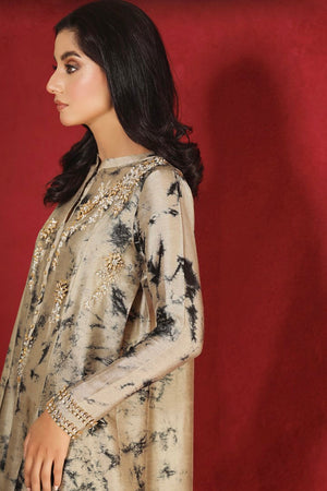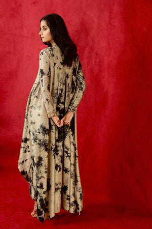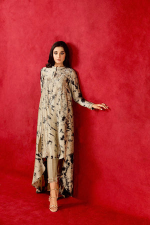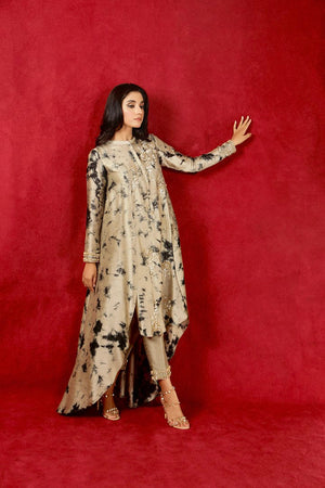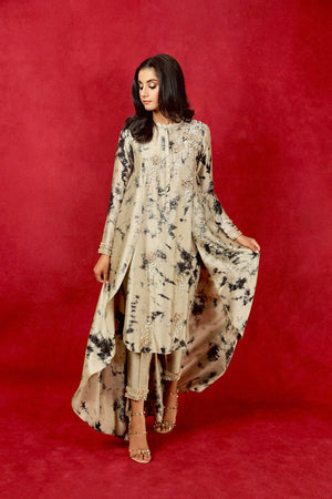 An irresistible hue of ombré dyed; black and dusty offwhite is complemented by floral Swarovski embellishments. A classic yet modern knee length raw silk shirt, with long back which consist of shaped box pleats, to give it a sliming flow. Paired with straight raw silk pants with Swarovski work.