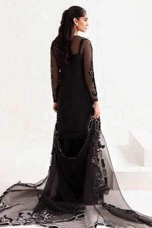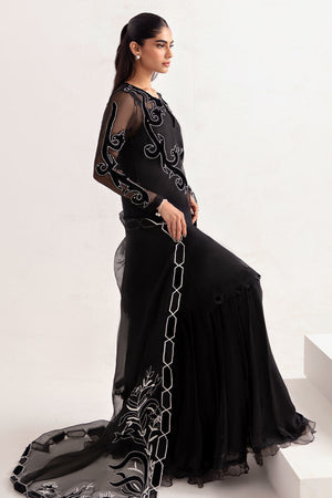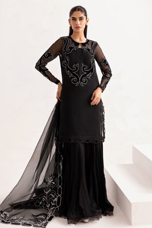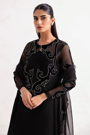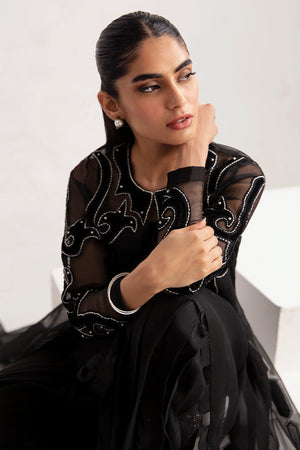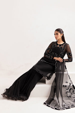 The timeless elegance of black takes centre stage in this ensemble. The organza shirt is adorned with applique work detailing on both the neckline and sleeves. The added pearls in a running stitch pattern further enhance its beauty. Pair it with our farshi gharara, which offers a wide-legged, flowing silhouette. The organza dupatta features matching detail on the edges and delicate embroidery, adding a final layer of charm to this classic and stylish outfit.