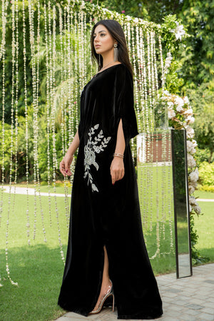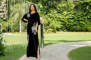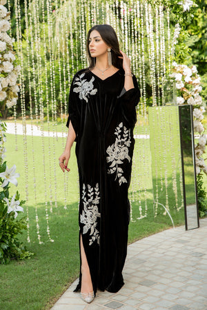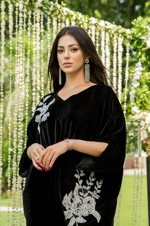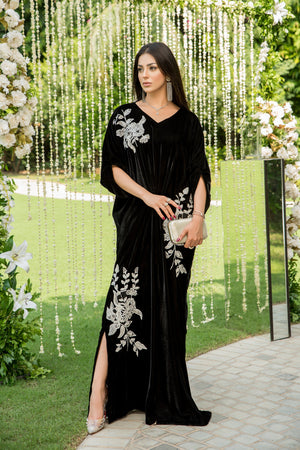 Indulge in the opulent Tilla embroidery that graces the shoulder, accompanied by exquisite appliqued patterns on the waist and hem, creating an elegant and refined flair.