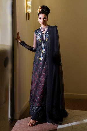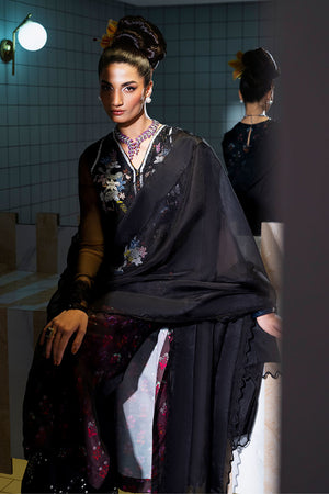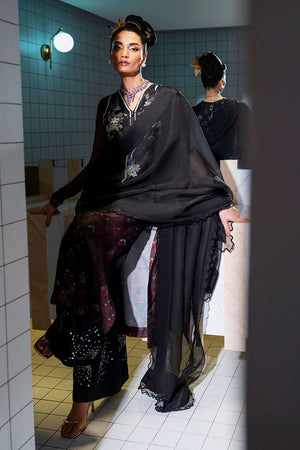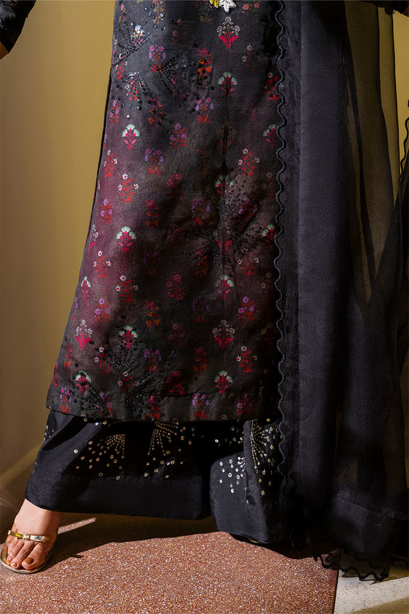 Includes: Shirt with Trousers Black Swan — timeless elegance with a bold twist. A V-neck long shirt paired with loose-fit trousers and an organza dupatta, featuring embroidered florals and exquisite hand embellishment, enhanced with vibrant kut dana and sequin motifs. Churidar sleeves with printed lining add a refined touch, while embellished trousers and a scalloped organza dupatta complete the look with effortless grace.