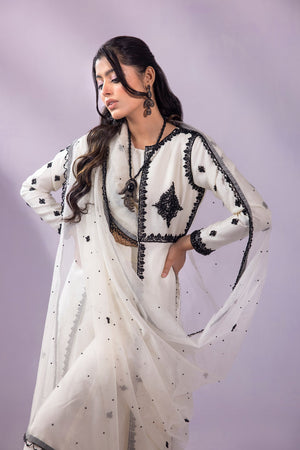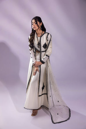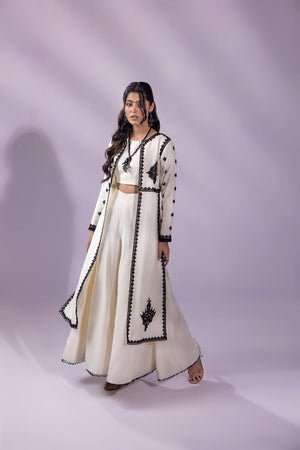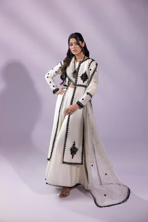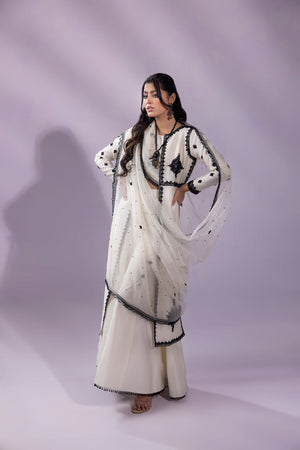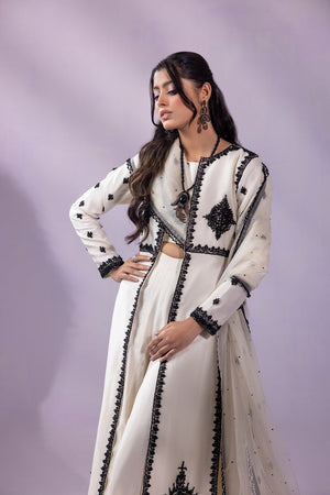 A chic ivory tissue organza front open long jacket embellished in the front gorgeously with black cut danna ,crystal and sequins along with black dabka & nakshi. It comes with an ivory bustier goes underneath the jacket and Its paired with a tissue organza pants with embellished borders makes it a classic design .Its organza dupatta has lace boarders on all sides of dupatta.
