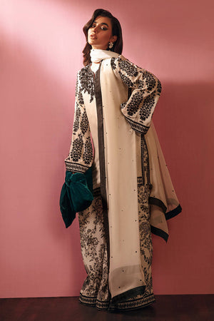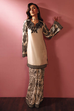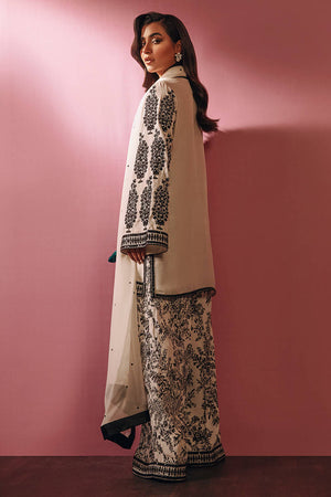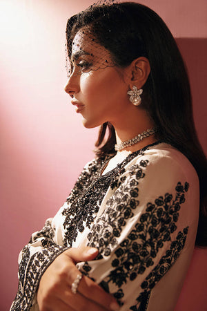 A stunning Ivory short shirt with heavy hand embellished ebony neckline and embroidered bell sleeves paired with printed pants, completed with sequence sprayed chiffon dupatta.