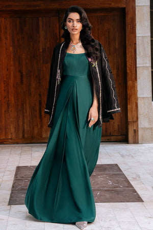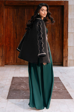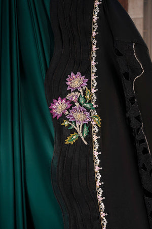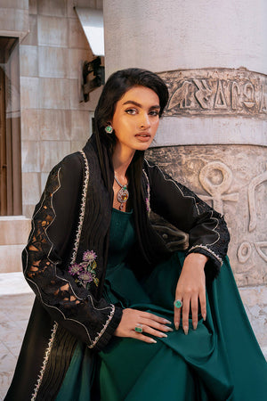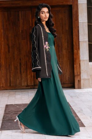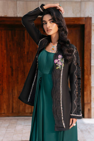 Black Wave is a classic statement piece crafted from pure raw silk. The sleek black jacket features intricately hand-embellished motifs, complemented by elegant cutwork and organza detailing on the sleeves for a modern, refined touch. The jacket is paired with a beautifully embroidered green inner, adding a bold contrast to the look. For added elevation, the ensemble can be styled with an ombré silk scarf—perfect for making a striking yet sophisticated impression.