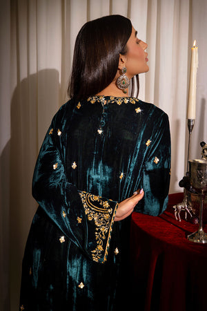 Indulge in the opulence of this emerald green velvet shirt, meticulously adorned with intricate gold zardozi embroidery and delicate gota accents. The shirt's luxurious fabric and exquisite craftsmanship exude an air of refined elegance. Complemented by velvet azhaar featuring a hand-embroidered border, this ensemble offers a harmonious blend of tradition and contemporary style. A pure organza dupatta, delicately edged with gota patti, adds a touch of ethereal charm, completing this sophisticated ensemble.