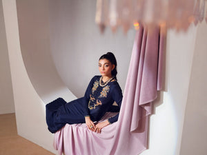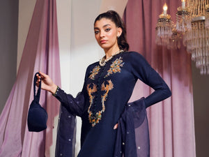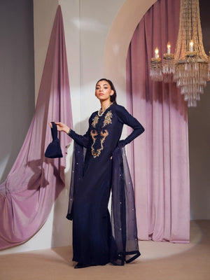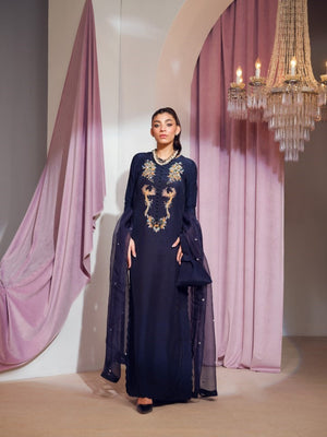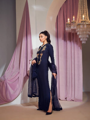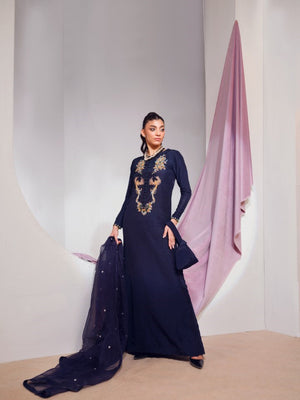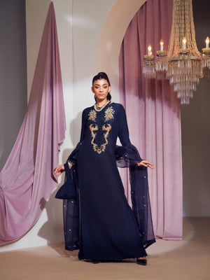 The gorgeous blue kaftan shirtis a versatile head turning piece to wear at any event. It incorporates refined jewel-like embellishments with unique elements. This perfect opulent straight long shirt is paired with an organza chun dupatta.