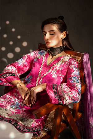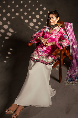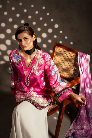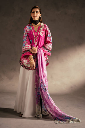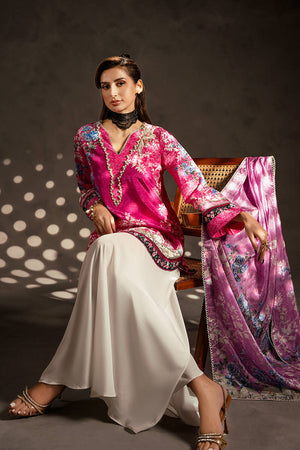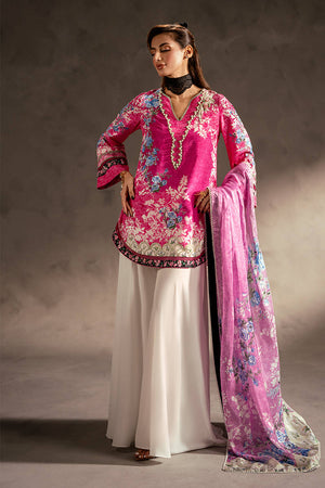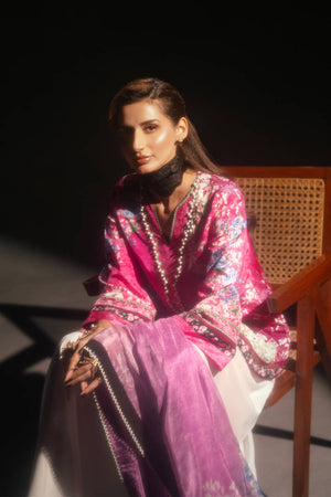 This lively pink silk short shirt showcases a captivating mix of prints, beautifully accented with lace detailing along the edges. The neckline is embellished with white pearls for an elegant finish, while delicate hand embellishments on the prints enhance its charm. Zainab Salman’s signature nightingale, richly hand-embellished, adds a luxurious and unique touch. The shirt is paired with a contrasting printed silk dupatta and white grip pants, creating a perfect blend of contemporary style and classic sophistication.