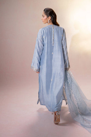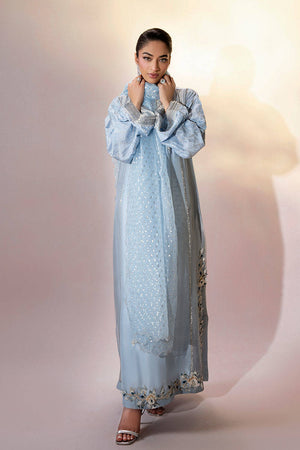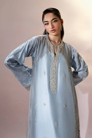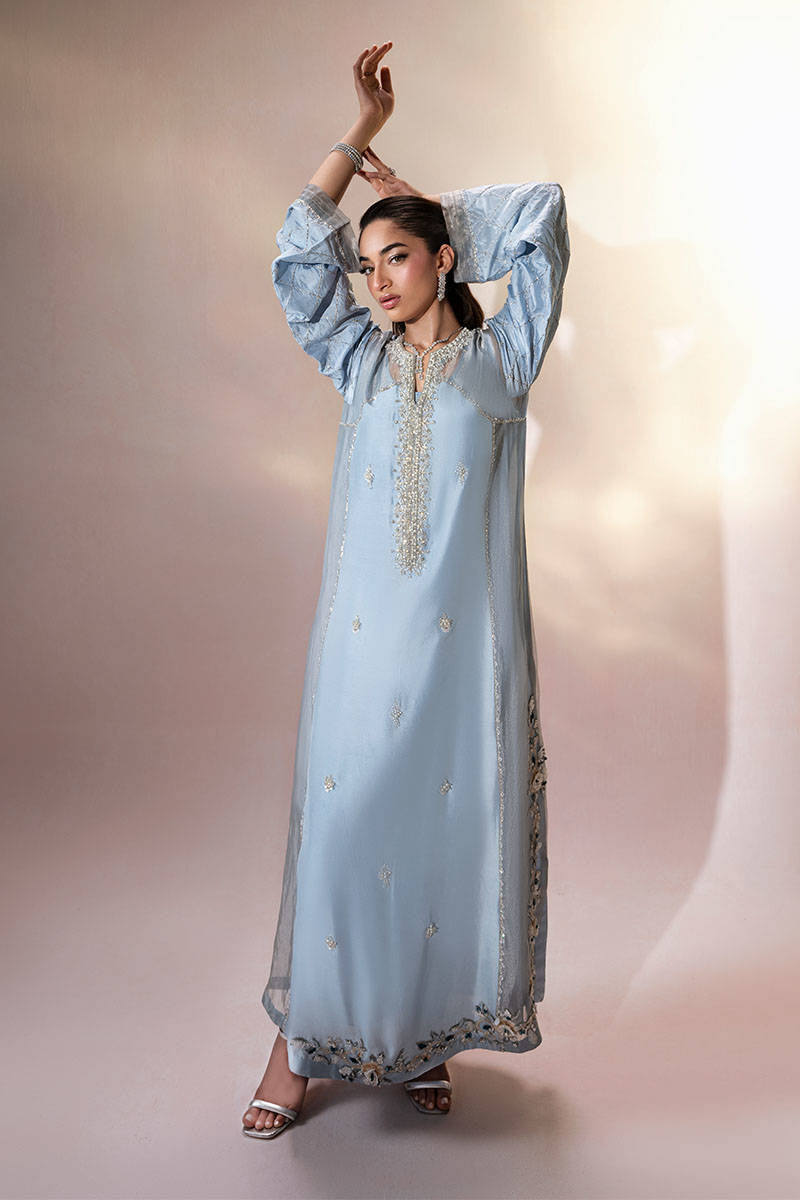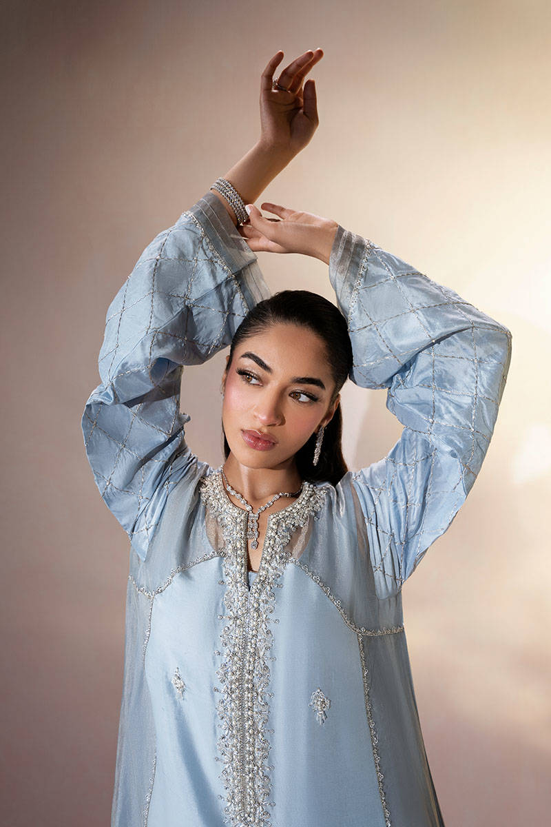 Blue Bird is a show-stopping kaftan shirt in pure raw silk, rendered in a serene ice blue tone. Featuring a distinctive hexagon-cut hem and adorned with intricately embroidered and hand-embellished motifs with teal green accents, this piece is a true statement-maker. Tila embroidery in a criss-cross pattern on the bell sleeves adds a festive flair. Paired with a matching organza dupatta, the kaftan can also be styled with trousers for a more modest yet striking look—perfect for celebrations and special occasions.