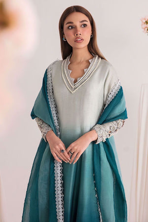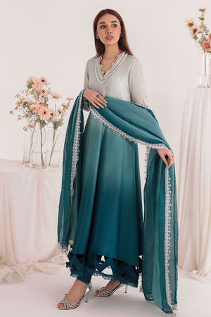 A master piece dipped in grey And blue hues. This stunning kalidar raw silk gown executed with handcrafted embellishment of sequin, pearls and zari on neckline and sleeves and fabric detailing with lace on the hemline. It comes with raw silk straight pants and a matching dupatta with a combination of organza and cotton net strips beautifully detailed with intricate lace on all four sides of it.