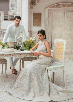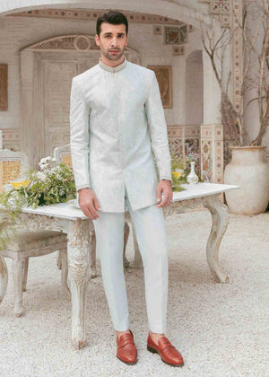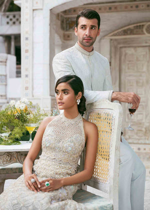 Description: The ceremonial set features a heavily embroidered ice blue open Prince jacket with the accents of handmade marori & wasli. Jacket is paired together with a tailored crisp pants.