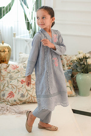 Periwinkle in-house signature schiffli A-line shirt completed with a Schiffli border along with single thread embroidery in periwinkle, mint and candy pink shades with finishings of self on self laces. Paired with cotton dyed pants.