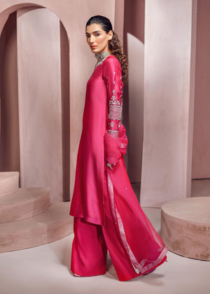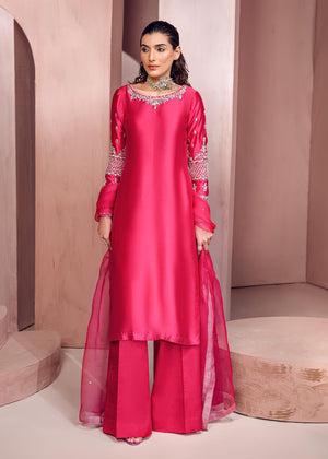 The canvas for this is a beautiful hot-pink silk tissue fabric. On the sleeves, we have impressive silver needlework in an opulent pattern. The needlework is coordinated with the embellishments on the neck which are in white and silver hues. This glorious piece is paired with a rhinestone-adorned organza dupatta.