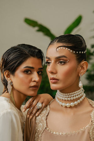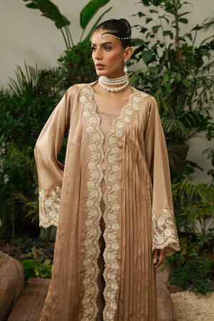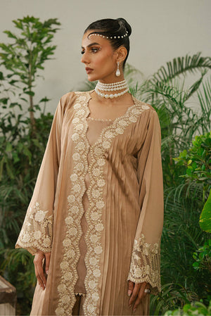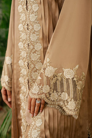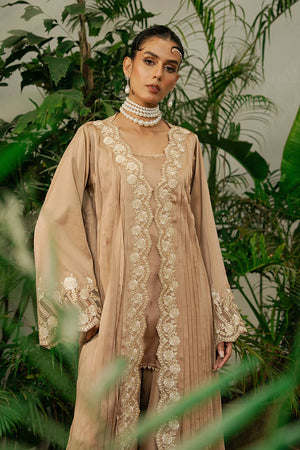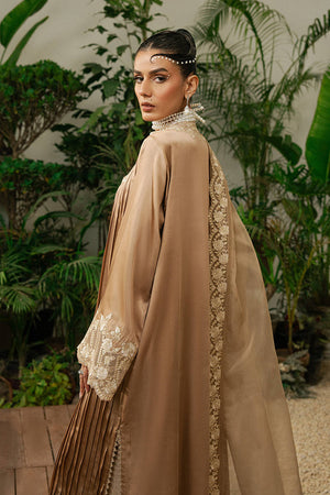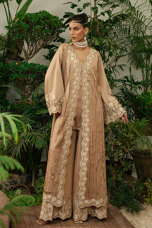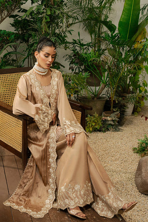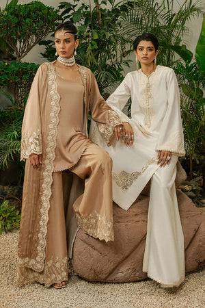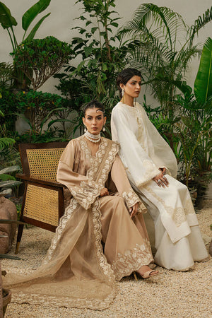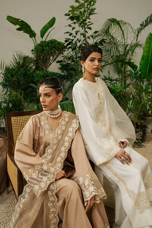 A blush beige satin silk shirt with soft pleats, embroidered with delicate floral scrolls in cream. The front-open silhouette has scalloped edges, giving it a structured yet relaxed feel. Satin silk trousers, embroidered at the cuffs, mirror the detailing of the shirt. A sheer organza dupatta, finished with a matching floral scroll border, ties it all together. Clean, minimal, and subtly detailed.