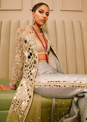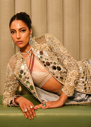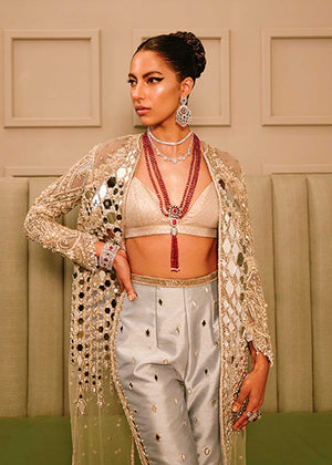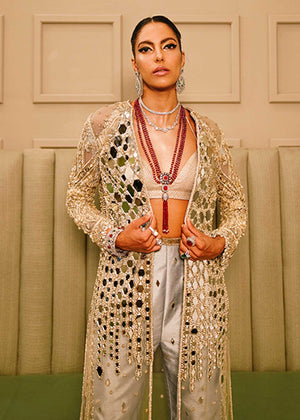 Description: Bombay Sapphire is a stunning statement piece that features zardozi detailing, with hand-worked resham embroidery and a mirror mosaic design that is reminiscent of the old school indo vibe. The silhouette is perfect for the chic millennials. The jacket and pants can be paired together for a glamorous evening, and is particularly captivating when dressed up with chunky jeweled accessories.