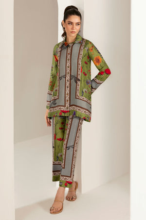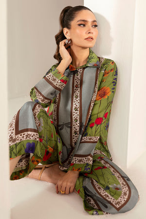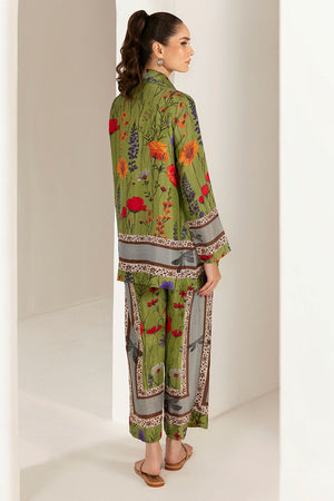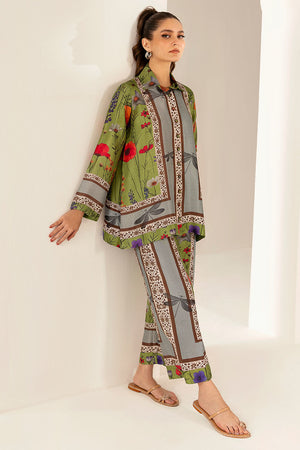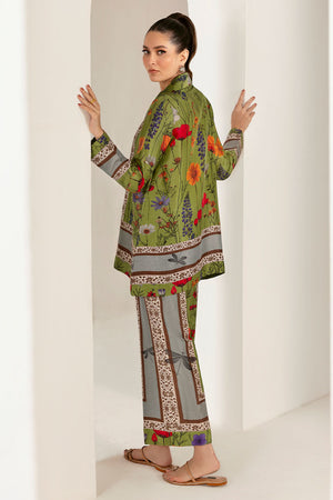 A charming green silk cord set featuring a button-down shirt adorned with delicate floral and dragonfly prints. The straight-cut pants offer a sleek, tailored fit, complementing the whimsical elegance of the top.