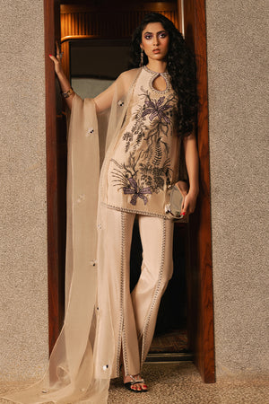Boujee Me – A bold expression of luxury and style. This halter short shirt features waist-high slits and a keyhole neckline elevated with contrasting piping details, creating an effortlessly chic silhouette. The front is adorned with exquisitely hand-embellished borders, intricate embroidered florals, and patchwork details. Paired with boot-cut trousers, styled with a front slit and embellished borders running from waist to hemline, this ensemble redefines contemporary elegance. The look is completed with an organza dupatta, enhanced by asymmetrical embellished motifs, adding a unique flair. Boujee Me is designed for the unapologetic fashionista, embodying glamour and sophistication in every stitch.