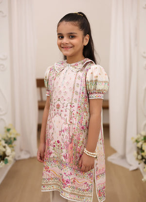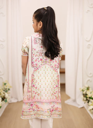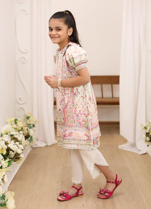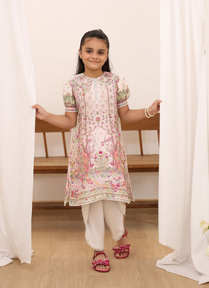 This sumptuous raw silk kurta for young girls is a stunning blend of elegance and whimsy. The shirt is printed with whimsical florals that bloom daintily all over the shirt, making this an absolute must have. The sleeves are finished with stunning embroidery