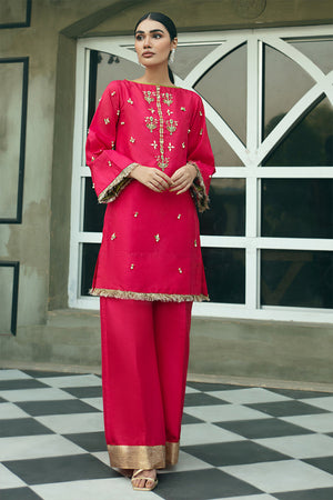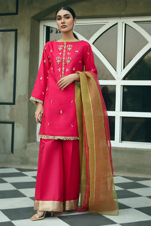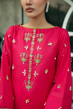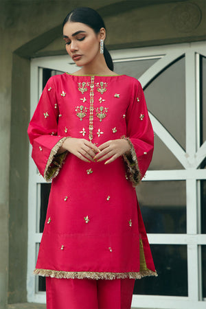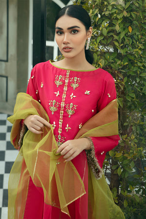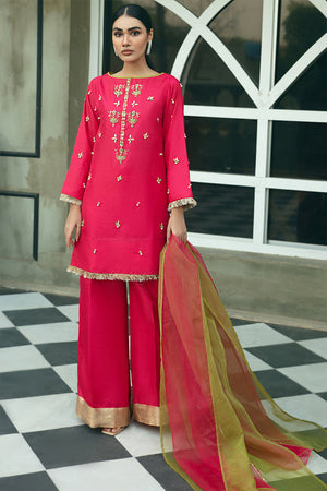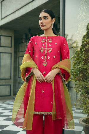 The Vivid Pink paired with apple green is the new trend setter of the season! This straight shirt features hand embellished boat neckline and long sleeves. Paired with contrast color block dupatta and wide flared pants!