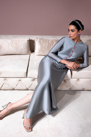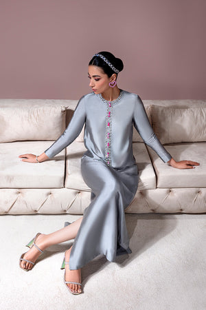Broosky enfolds a mesmerizing tale of artistic details on a grey canvas of tissue silk. The gleaming Kaftaan shirt effortlessly adds charm to the poise and finesse of the wearer with straight sleeves. The beautiful ornamentation of sparkle motif along with button detailing paired along is a stunning organza dupatta finished to perfection with crystal chan all over, giving it the perfect allure!