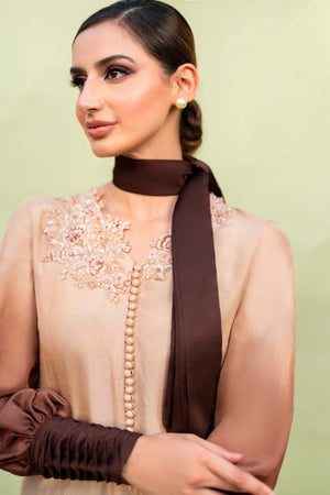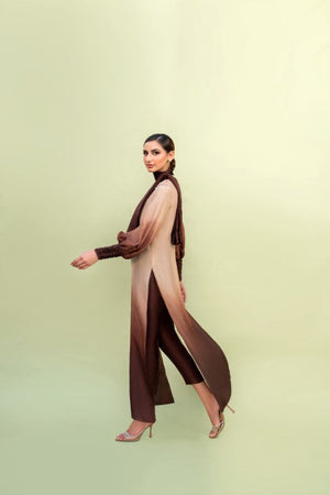 An exquisite slim-fit ombre long shirt in rich coffee tones, boasting intricate embellished motifs gracing the neckline, accentuated by delicate loop button detailing for a touch of refinement. The shirt exudes sophistication with its sophisticated pleated sleeves adorned with tasteful button embellishments, adding a hint of glamour to the ensemble. Paired effortlessly with straight pants in the same alluring shade, this ensemble exudes understated elegance and timeless charm. Elevate the look to sublime sophistication by accessorizing with a luxurious silk dupatta, completing the ensemble with a flourish of grace and style.