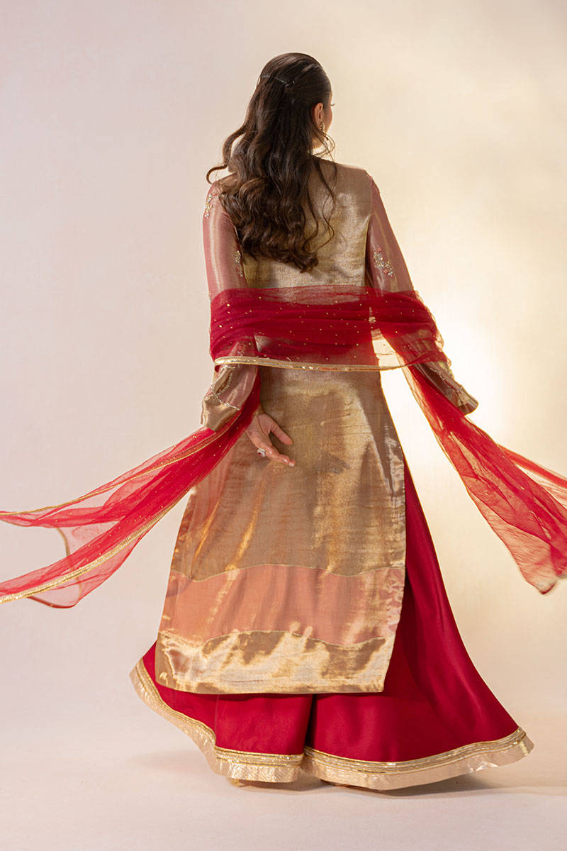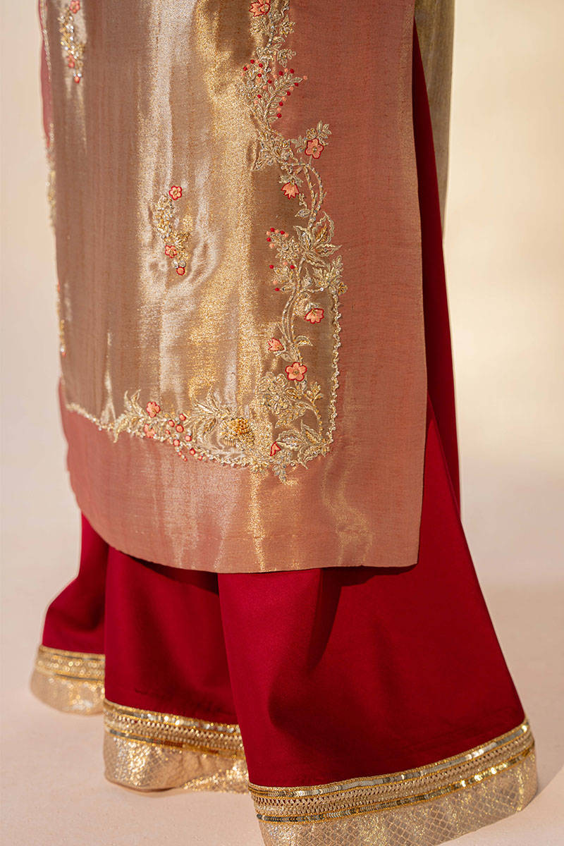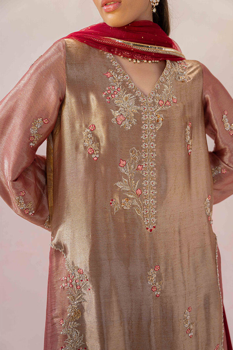 A statement long shirt in pure tissue, "Brown Sun" features a striking contrast of rose gold and copper tones. The silhouette is adorned with intricate resham embroidery and handworked floral motifs crafted in silver and gold kora, dabka, and delicate embellishments.It is paired with a contrasting sheer net dupatta, beautifully finished with all-over sequin chatta, adding a touch of modern elegance. Completed with classic raw silk Dhaka pants with gold finishings, this timeless ensemble is a must-have for your formal wardrobe.