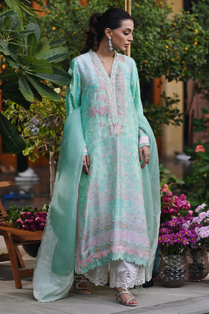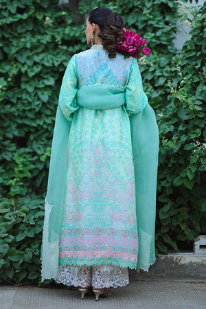 An elegant aqua green digitally printed long shirt with delicate hints of pink, adorned with intricate embroidery, cutdana, tikki stones, and sitara accents. Featuring a tilla patti neckline, it is paired with an ethereal organza dupatta and izaar pants embellished with lace borders.