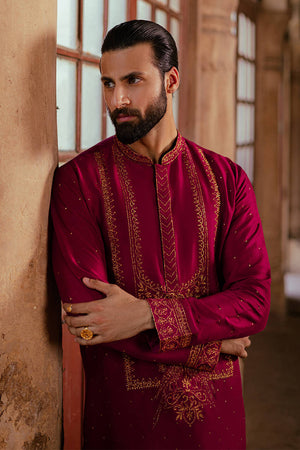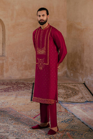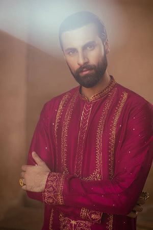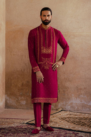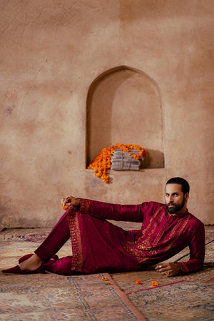 Ensemble Buraak from the 'Raag Darbari' collection, in a luxurious shade of Burma ruby, exudes royal magnificence. The pure raw silk kurta and slim trousers are intricately embroidered with resham thread work, metallic baddla accents, and a fine spray of mukesh, inspired by the vibrant floral frescoes of Asaf Jah Haveli. The embroidery elegantly decorates the button placket, collar, and sleeves, making this piece an ideal choice for any celebration.