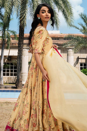 Butter Bloom is an ethereal Zainab Salman classic—crafted in screen-printed raw silk in a graceful kalidar silhouette. The design features an intricately hand-embellished bodice, paired with sophisticated Indian-style sleeves and contrasting pink printed borders that add a soft, feminine charm. The look can be completed with straight pants in a matching hue and a luxurious silk dupatta, making it a perfect blend of timeless elegance and contemporary grace.