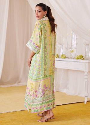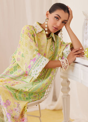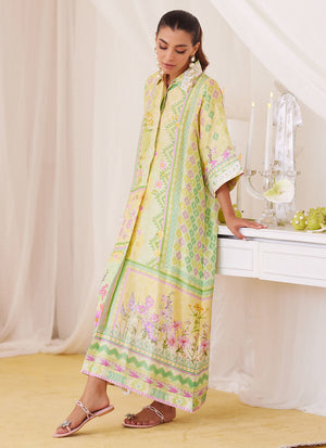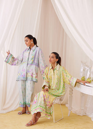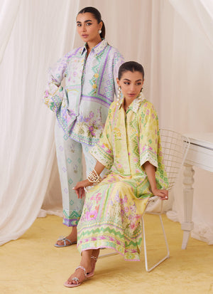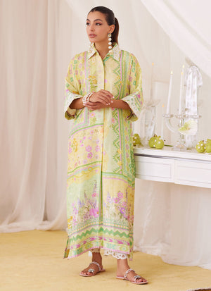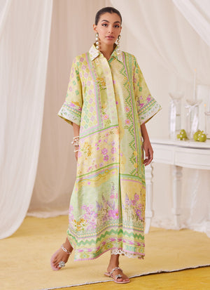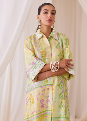 Irresistibly romantic florals, luxe fabrics and captivating details for the ultimate wardrobe reset!! Cut from sumptuous raw silk, the lemon and pink shirt dress is printed with whimsical florals paired with geometric elements, designed to catch the eye over and over, making this an absolute must have. The relaxed, much loved silhouette has a universally flattering round neckline, while the sleeves adorned with ivory silk thread work makes this outfit feel like a dream. Pair yours with pure raw silk pants (as shown) to breeze through any and all festivities.
