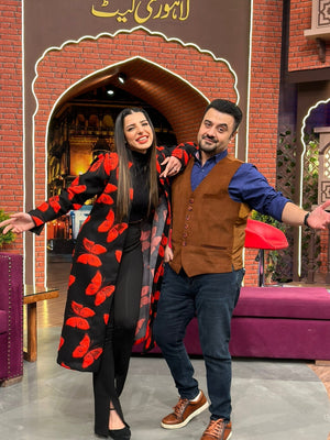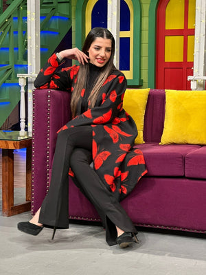 Soft jacquard printed butterfly jacket in red and black hues. Perfect for spring. Stitched to perfection. Available in all sizes. Limited stock available only.