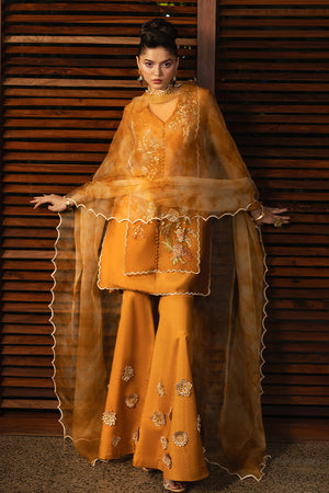 Cali Bling, a standout ensemble that blends modern flair with intricate craftsmanship. The V-neck, mid-thigh shirt is paired with a flared boot-cut trouser, creating a sleek silhouette that balances style and comfort. Exquisite embroidery and embellishments adorn the front organza panels, elevated by loop button details for a refined touch. The shirt also features waist-high slits with scalloped edge details and three-quarter sleeves, adding elegance and movement to your look. The panelled boot-cut trousers are beautifully complemented with three-dimensional embroidered florals, enhancing the overall design. Completing this chic outfit is a tie-dye organza dupatta, featuring inverted embroidered scallops that bring a fresh, artistic twist to the ensemble. Cali Bling is the perfect choice for those who crave both timeless elegance and contemporary glamour