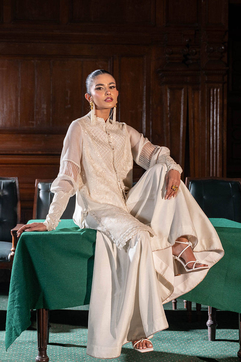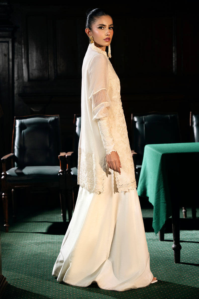 Caramel is a show-stopping khaddi net mid-length jacket, adorned with tonal embroidery and delicate sequin work for a touch of understated glamour. The addition of elegant tassels enhances its charm, creating a statement-making silhouette. Paired with exaggerated wide-leg pants, this ensemble exudes contemporary sophistication.