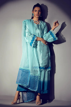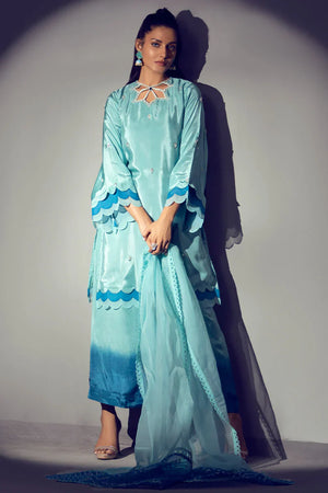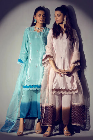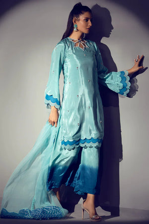 Premium Russian silk embellished with handwork of cutwork details, pearls, kora and stones beautified with 3 colors of organza scalop border on sleeves and daman paired up with tie and dye cuolettes styled with organza dopatta having contrast color organza embroidered borders with laces on edges. Length of shirt is 38 inches and cuolette is 38 inches.Model is wearing size small and her height is 5'8. Weight of this product is 1 kg