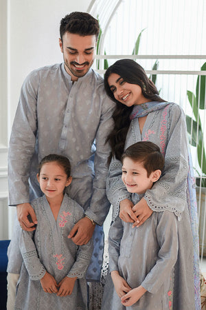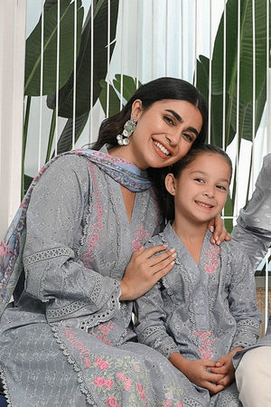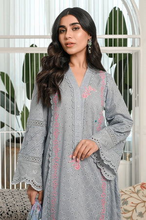 Periwinkle in-house signature schiffli A-line shirt completed with a Schiffli border along with single thread embroidery in periwinkle, mint and candy pink shades with finishings of self on self laces. Paired with digital printed medium silk dupatta and cotton dyed pants.